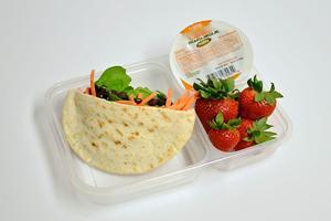 Whole grain pita stuffed with beans (black beans or refried) shredded carrots, greens, cheese + avocado slices (or guacamole) and fresh salsa + strawberries |