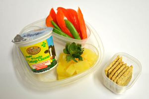 Cottage cheese + colorful sweet peppers & pea pods + whole grain crackers (like Triscuits) + pineapple chunks |