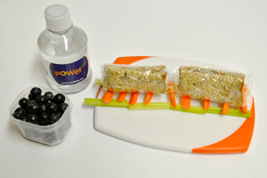Choo-Choo! Train on a track: build it with nut* butter and jelly sandwich rectangles + carrot and celery sticks (for the tracks) + blueberries