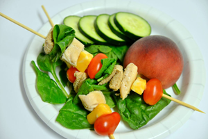 Sandwich on a stick: cut outs of whole wheat bread or bagel, roasted chicken (left overs work great), cheese (cubes), spinach leaves, cherry tomatoes + cucumber rounds + peach or nectarine