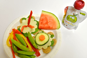 Cheese and Greens Sandwich Flowers* (made with spinach leaves, natural cheese slice , cucumber round on whole grain bread) + colorful sweet peppers & pea pods + watermelon wedge + apple sauce
