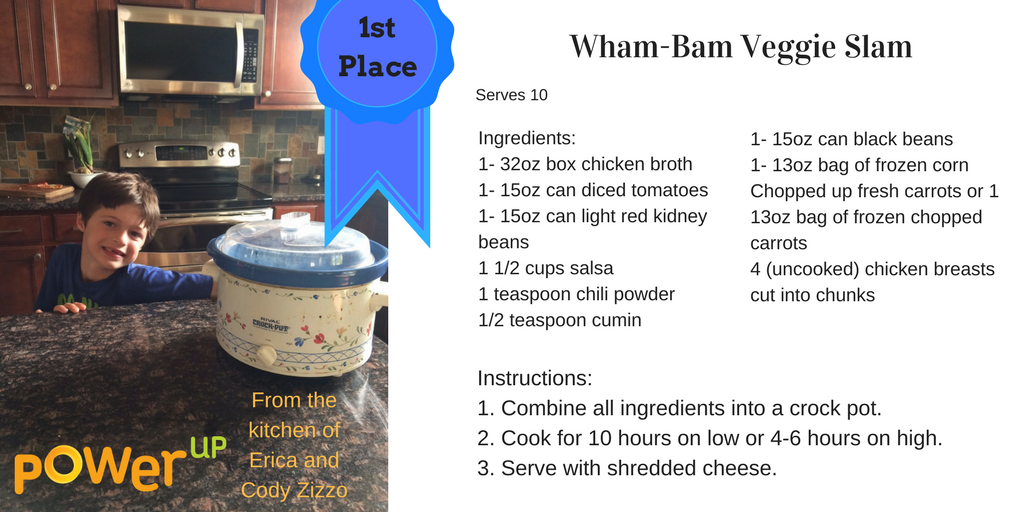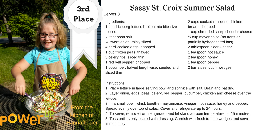 POWER CHEF RECIPE CONTEST ANNOUNCEMENT!! Thank you to all who sent in tasty recipes for the Power Chef Recipe Contest! The top 5 recipes were selected through social media voting and were voted on by our All-star community Judges. We now have the winners! We are very pleased to announce that Wham Bam Veggie Slam by Cody Z from Mahtomedi is the first place recipe! Congratulations, Cody! Congratulations to our other tasty winners! 2nd place: Chickpea CHOP CHOP by Lucy F from Ellsworth, WI. 3rd place: Sassy St. Croix Summer Salad by Hanna L from Stillwater, MN. 4th place: Sloppiest Joe's by Brady J tied with Banana Blast by Tiffanni S from Amery, WI. Honorable Mentions: - Veggie Fiesta Lasagna by Jen P - Fresh Salad by Dana J - Freggie Spicy Dip by Prashanth R